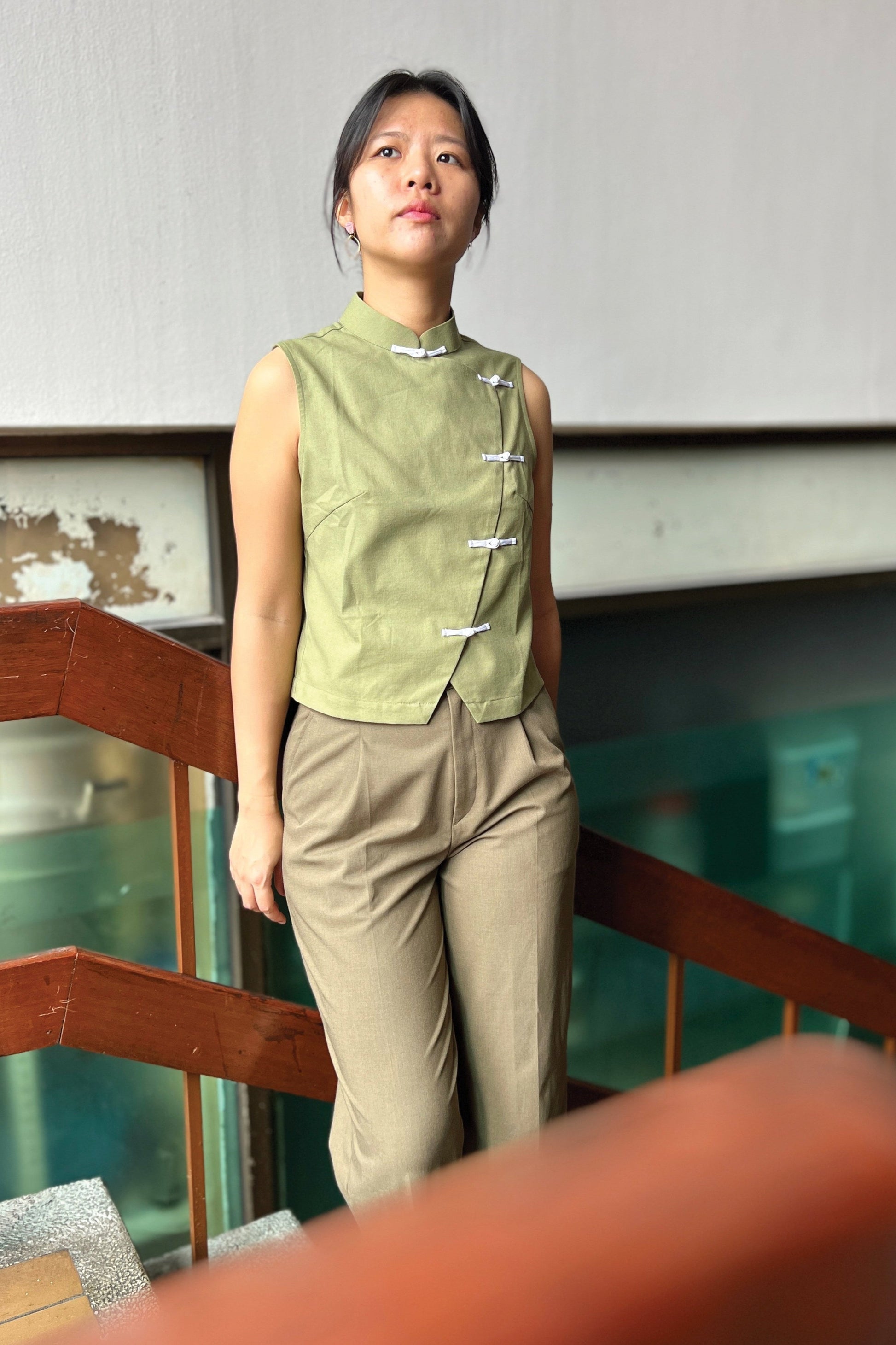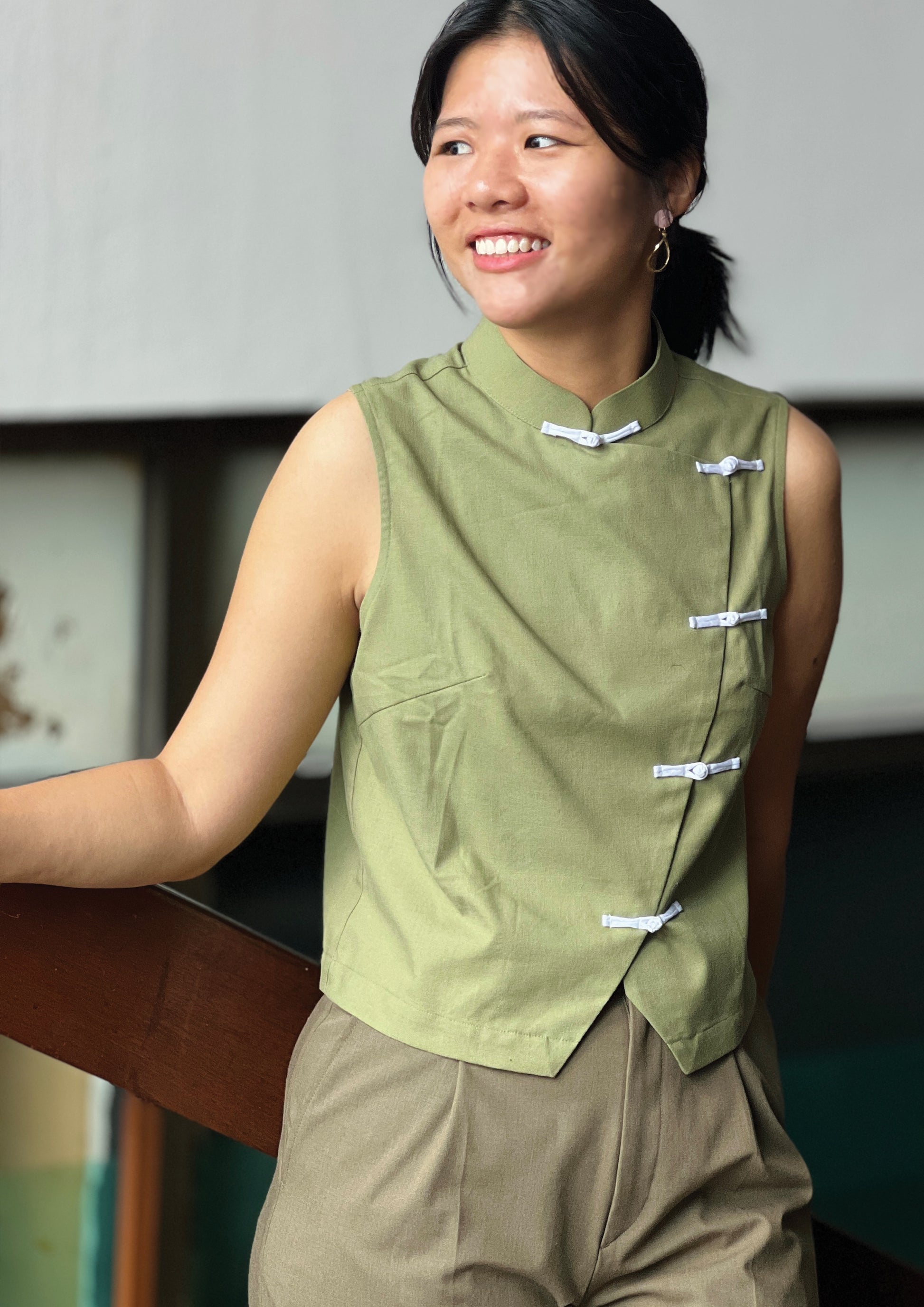 This top is your go-to for effortless style with a dash of tradition! The Jade Sleeveless Samfu Top is made from breezy linen, it's cool enough for laid-back fun but classy enough for those formal moments.